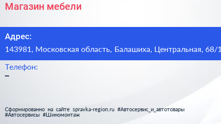 Магазин мебели по адресу 143981, Московская область, Балашиха, Центральная, 68/1 в дальнейшем Организация, размещена в следующих категориях: