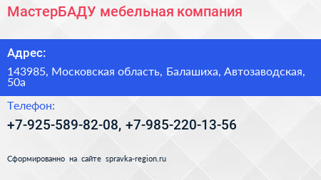 МастерБАДУ, мебельная компания по адресу 143985, Московская область, Балашиха, Автозаводская, 50а в дальнейшем Организация, размещена в следующих категориях: