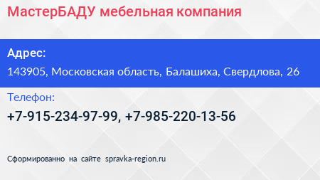 МастерБАДУ, мебельная компания по адресу 143905, Московская область, Балашиха, Свердлова, 26 в дальнейшем Организация, размещена в следующих категориях: