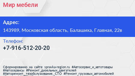 Мир мебели по адресу 143989, Московская область, Балашиха, Главная, 22в в дальнейшем Организация, размещена в следующих категориях: