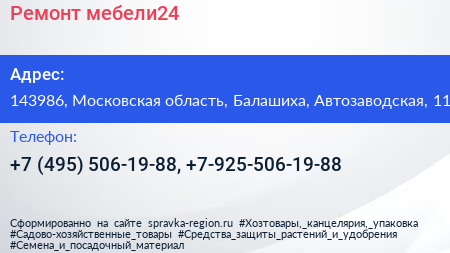 Ремонт-мебели24 по адресу 143986, Московская область, Балашиха, Автозаводская, 11 в дальнейшем Организация, размещена в следующих категориях: