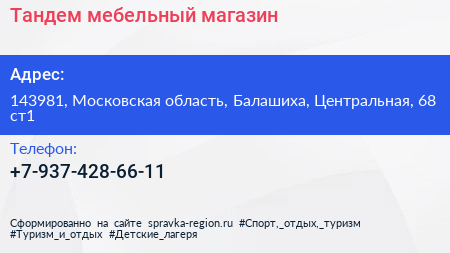 Тандем, мебельный магазин по адресу 143981, Московская область, Балашиха, Центральная, 68 ст1 в дальнейшем Организация, размещена в следующих категориях: