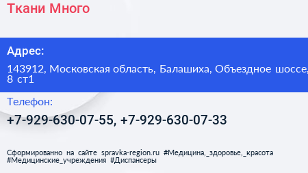 Ткани Много по адресу 143912, Московская область, Балашиха, Объездное шоссе, 8 ст1 в дальнейшем Организация, размещена в следующих категориях: