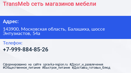 TransMeb, сеть магазинов мебели по адресу 143900, Московская область, Балашиха, шоссе Энтузиастов, 54а в дальнейшем Организация, размещена в следующих категориях: