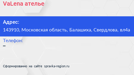 VaLena, ателье по адресу 143910, Московская область, Балашиха, Свердлова, вл4а в дальнейшем Организация, размещена в следующих категориях: