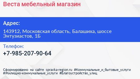 Веста, мебельный магазин по адресу 143912, Московская область, Балашиха, шоссе Энтузиастов, 1Б в дальнейшем Организация, размещена в следующих категориях: