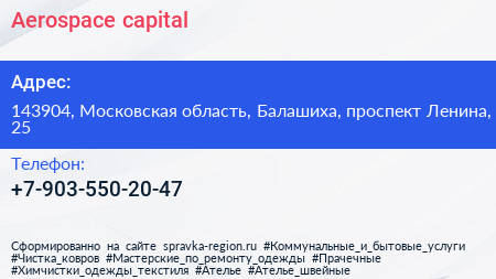 Aerospace capital по адресу 143904, Московская область, Балашиха, проспект Ленина, 25 в дальнейшем Организация, размещена в следующих категориях: