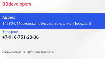 BBdevelopers по адресу 143904, Московская область, Балашиха, Победы, 8 в дальнейшем Организация, размещена в следующих категориях: