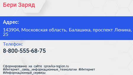 Бери Заряд! по адресу 143904, Московская область, Балашиха, проспект Ленина, 25 в дальнейшем Организация, размещена в следующих категориях: