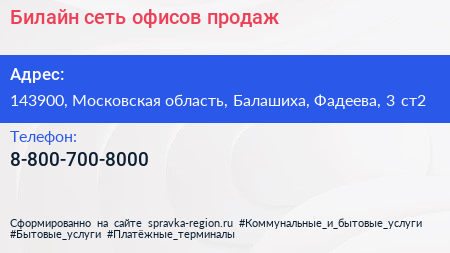 Билайн, сеть офисов продаж по адресу 143900, Московская область, Балашиха, Фадеева, 3 ст2 в дальнейшем Организация, размещена в следующих категориях: