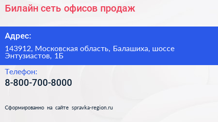 Билайн, сеть офисов продаж по адресу 143912, Московская область, Балашиха, шоссе Энтузиастов, 1Б в дальнейшем Организация, размещена в следующих категориях: