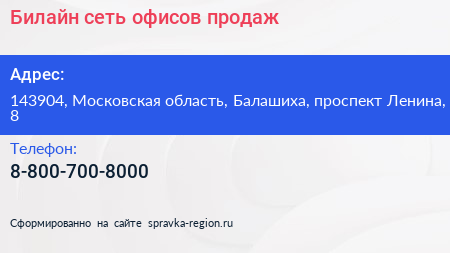 Билайн, сеть офисов продаж по адресу 143904, Московская область, Балашиха, проспект Ленина, 8 в дальнейшем Организация, размещена в следующих категориях: