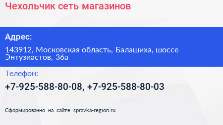 Чехольчик, сеть магазинов по адресу 143912, Московская область, Балашиха, шоссе Энтузиастов, 36а в дальнейшем Организация, размещена в следующих категориях: