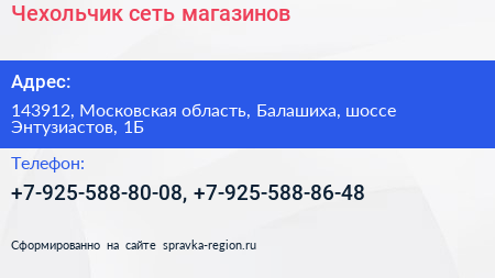 Чехольчик, сеть магазинов по адресу 143912, Московская область, Балашиха, шоссе Энтузиастов, 1Б в дальнейшем Организация, размещена в следующих категориях: