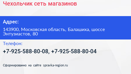 Чехольчик, сеть магазинов по адресу 143900, Московская область, Балашиха, шоссе Энтузиастов, 80 в дальнейшем Организация, размещена в следующих категориях: