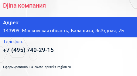 Djina, компания по адресу 143909, Московская область, Балашиха, Звёздная, 7Б в дальнейшем Организация, размещена в следующих категориях: