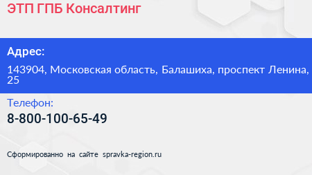 ЭТП ГПБ Консалтинг по адресу 143904, Московская область, Балашиха, проспект Ленина, 25 в дальнейшем Организация, размещена в следующих категориях: