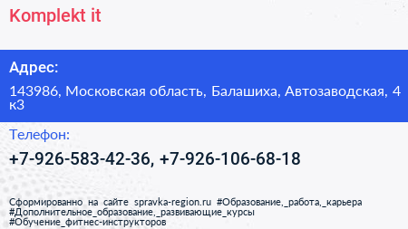 Komplekt-it по адресу 143986, Московская область, Балашиха, Автозаводская, 4 к3 в дальнейшем Организация, размещена в следующих категориях: