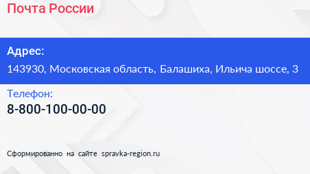 Почта России по адресу 143930, Московская область, Балашиха, Ильича шоссе, 3 в дальнейшем Организация, размещена в следующих категориях: