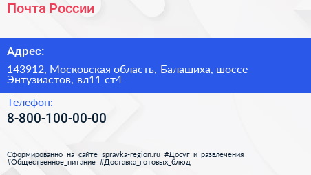 Почта России по адресу 143912, Московская область, Балашиха, шоссе Энтузиастов, вл11 ст4 в дальнейшем Организация, размещена в следующих категориях: