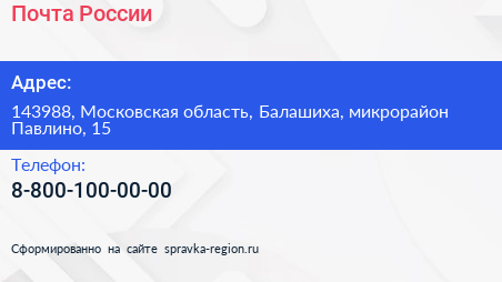 Почта России по адресу 143988, Московская область, Балашиха, микрорайон Павлино, 15 в дальнейшем Организация, размещена в следующих категориях: