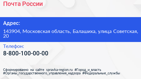 Почта России по адресу 143904, Московская область, Балашиха, улица Советская, 20 в дальнейшем Организация, размещена в следующих категориях: