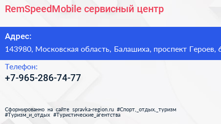 RemSpeedMobile, сервисный центр по адресу 143980, Московская область, Балашиха, проспект Героев, 6 в дальнейшем Организация, размещена в следующих категориях: