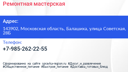 Ремонтная мастерская по адресу 143902, Московская область, Балашиха, улица Советская, 28Б в дальнейшем Организация, размещена в следующих категориях: