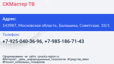 СКМастер-ТВ по адресу 143987, Московская область, Балашиха, Советская, 33/1 в дальнейшем Организация, размещена в следующих категориях:
