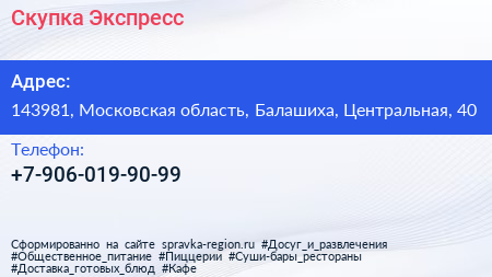 Скупка Экспресс по адресу 143981, Московская область, Балашиха, Центральная, 40 в дальнейшем Организация, размещена в следующих категориях: