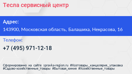Тесла, сервисный центр по адресу 143900, Московская область, Балашиха, Некрасова, 16 в дальнейшем Организация, размещена в следующих категориях: