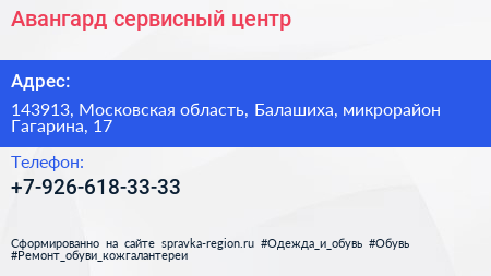 Авангард, сервисный центр по адресу 143913, Московская область, Балашиха, микрорайон Гагарина, 17 в дальнейшем Организация, размещена в следующих категориях: