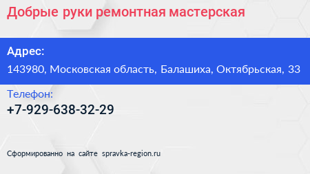 Добрые руки, ремонтная мастерская по адресу 143980, Московская область, Балашиха, Октябрьская, 33 в дальнейшем Организация, размещена в следующих категориях: