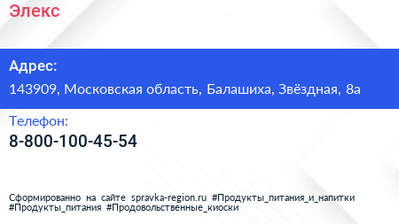 Элекс по адресу 143909, Московская область, Балашиха, Звёздная, 8а в дальнейшем Организация, размещена в следующих категориях: