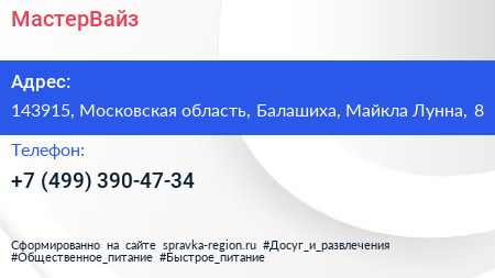 МастерВайз по адресу 143915, Московская область, Балашиха, Майкла Лунна, 8 в дальнейшем Организация, размещена в следующих категориях: