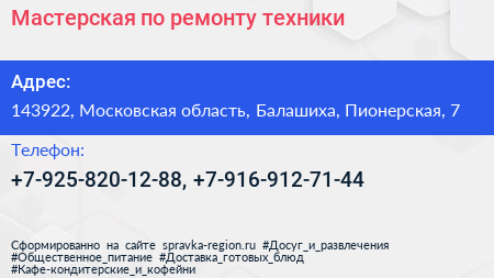 Мастерская по ремонту техники по адресу 143922, Московская область, Балашиха, Пионерская, 7 в дальнейшем Организация, размещена в следующих категориях: