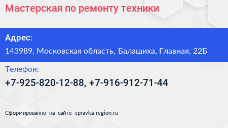 Мастерская по ремонту техники по адресу 143989, Московская область, Балашиха, Главная, 22Б в дальнейшем Организация, размещена в следующих категориях: