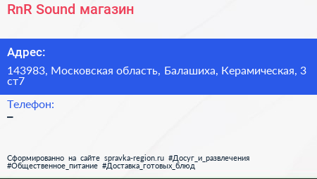 RnR Sound, магазин по адресу 143983, Московская область, Балашиха, Керамическая, 3 ст7 в дальнейшем Организация, размещена в следующих категориях: