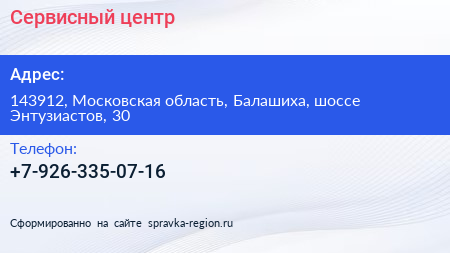 Сервисный центр по адресу 143912, Московская область, Балашиха, шоссе Энтузиастов, 30 в дальнейшем Организация, размещена в следующих категориях: