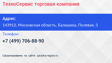 ТехноСервис, торговая компания по адресу 143912, Московская область, Балашиха, Полевая, 3 в дальнейшем Организация, размещена в следующих категориях: