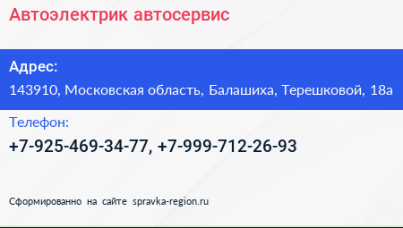 Автоэлектрик, автосервис по адресу 143910, Московская область, Балашиха, Терешковой, 18а в дальнейшем Организация, размещена в следующих категориях: