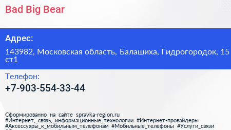 Bad Big Bear по адресу 143982, Московская область, Балашиха, Гидрогородок, 15 ст1 в дальнейшем Организация, размещена в следующих категориях: