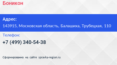Боникон по адресу 143915, Московская область, Балашиха, Трубецкая, 110 в дальнейшем Организация, размещена в следующих категориях:
