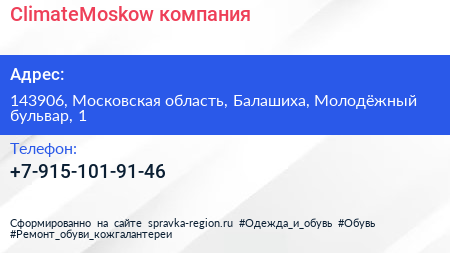 ClimateMoskow, компания по адресу 143906, Московская область, Балашиха, Молодёжный бульвар, 1 в дальнейшем Организация, размещена в следующих категориях: