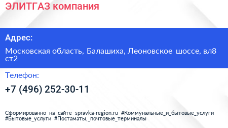 ЭЛИТГАЗ, компания по адресу Московская область, Балашиха, Леоновское шоссе, вл8 ст2 в дальнейшем Организация, размещена в следующих категориях: