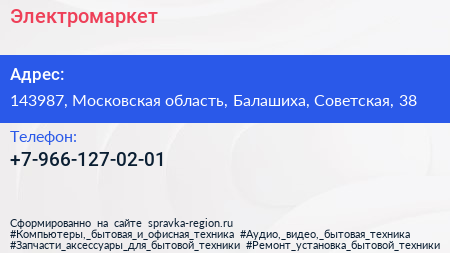 Электромаркет по адресу 143987, Московская область, Балашиха, Советская, 38 в дальнейшем Организация, размещена в следующих категориях:
