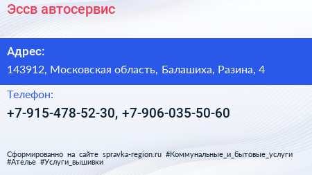 Эссв, автосервис по адресу 143912, Московская область, Балашиха, Разина, 4 в дальнейшем Организация, размещена в следующих категориях: