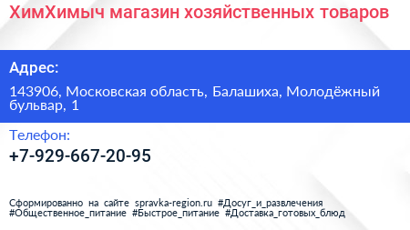 ХимХимыч, магазин хозяйственных товаров по адресу 143906, Московская область, Балашиха, Молодёжный бульвар, 1 в дальнейшем Организация, размещена в следующих категориях: