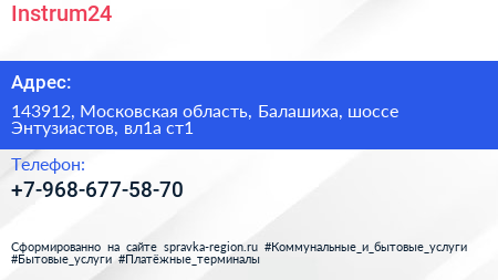 Instrum24 по адресу 143912, Московская область, Балашиха, шоссе Энтузиастов, вл1а ст1 в дальнейшем Организация, размещена в следующих категориях: