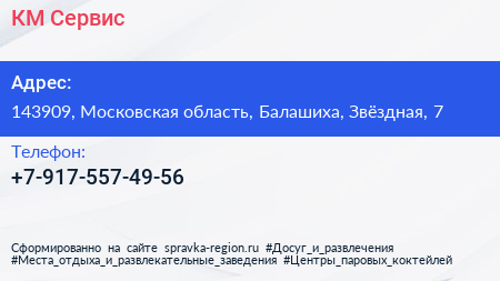 КМ-Сервис по адресу 143909, Московская область, Балашиха, Звёздная, 7 в дальнейшем Организация, размещена в следующих категориях: